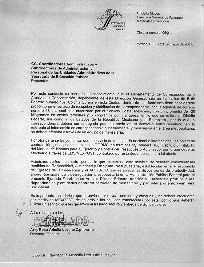 | Circular número 05/01 | 23 - III - 2001 | Se comunican disposiciones para el uso del servicio de mensajería nacional e internacional. |