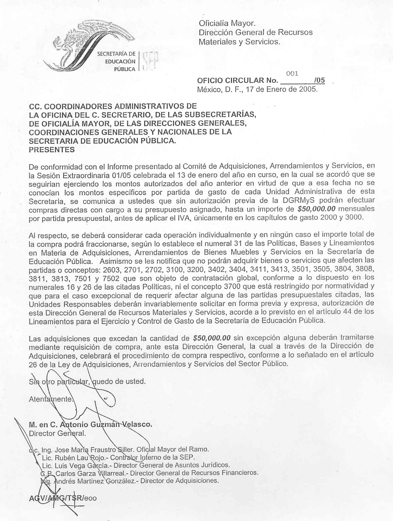 | Circular número 001/05 | 17 - I - 2005 | Autorización para efectuar compras directas hasta un importe de $ 50,000.00 mensuales. |